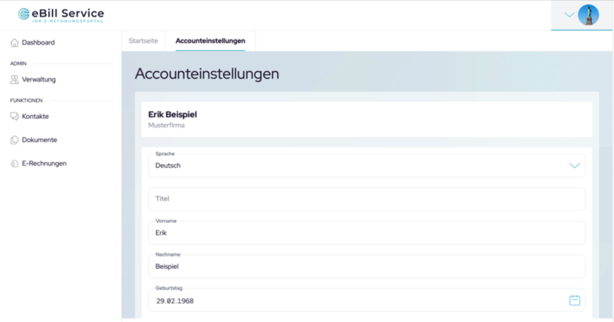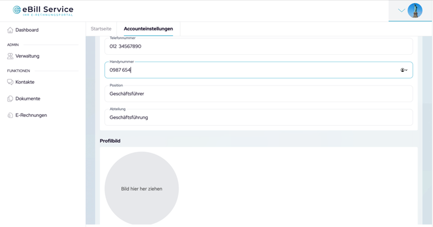 In den „Accounteinstellungen“ können Sie Änderungen vornehmen, wie z. B. persönliche Daten aktualisieren. Sie haben die Möglichkeit Telefonnummer und Mobilfunknummer zu hinterlegen und ein Profilbild einzufügen. Zusätzlich können Sie ihr aktuelles eBill-Service Passwort durch ein neues ersetzen.