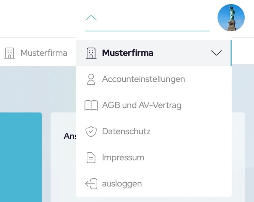 Um in Ihr Benutzerprofil zu gelangen, klicken Sie einfach auf den Drop-Down-Pfeil oder auf den Kreis mit Ihrem Kürzel/Bild oben rechts auf der Seite. Dort finden Sie alle wichtigen Informationen zu Ihrem Konto.
