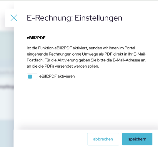 Wenn Sie nach wie vor noch PDF-Rechnungen erhalten und diese an Ihre oben hinterlegte E-Mail-Adresse weitergeleitet werden sollen, schieben Sie dazu den Regler nach rechts und klicken Sie auf „Speichern“.