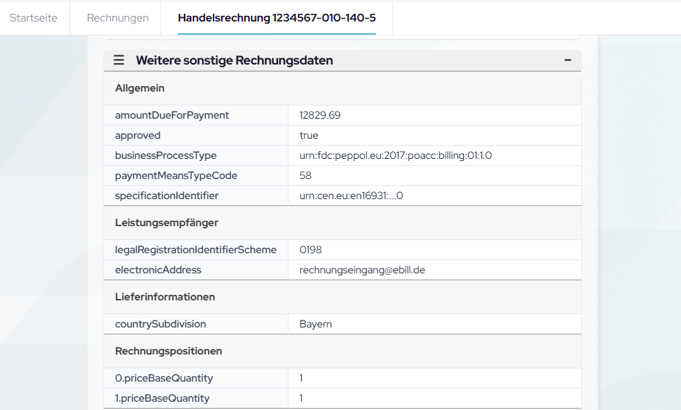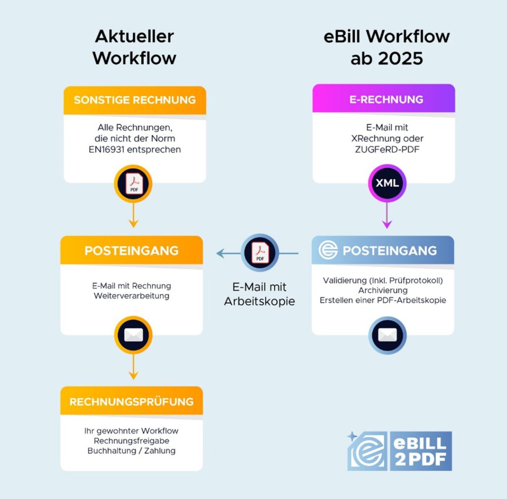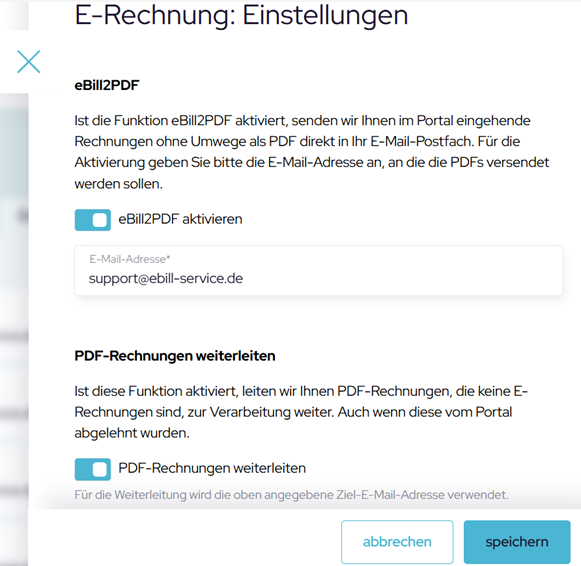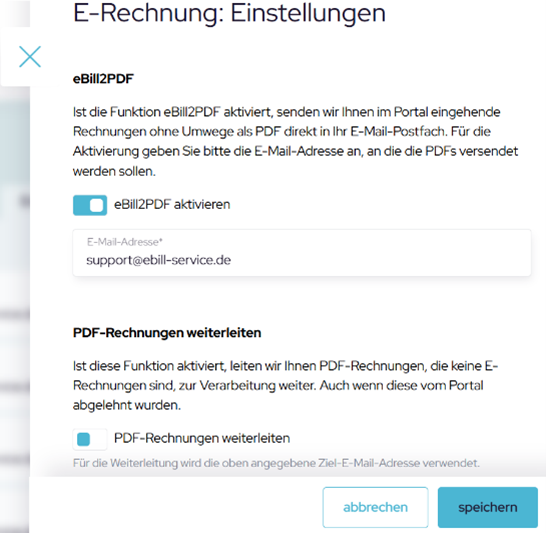 Wichtig: Die normalen PDF-Rechnungen werden von eBill nicht archiviert, da sie nicht den Anforderungen der europäischen Norm CEN 16931 entsprechen. Eine Weiterleitung ist nur möglich, wenn die eBill2PDF aktiviert ist.