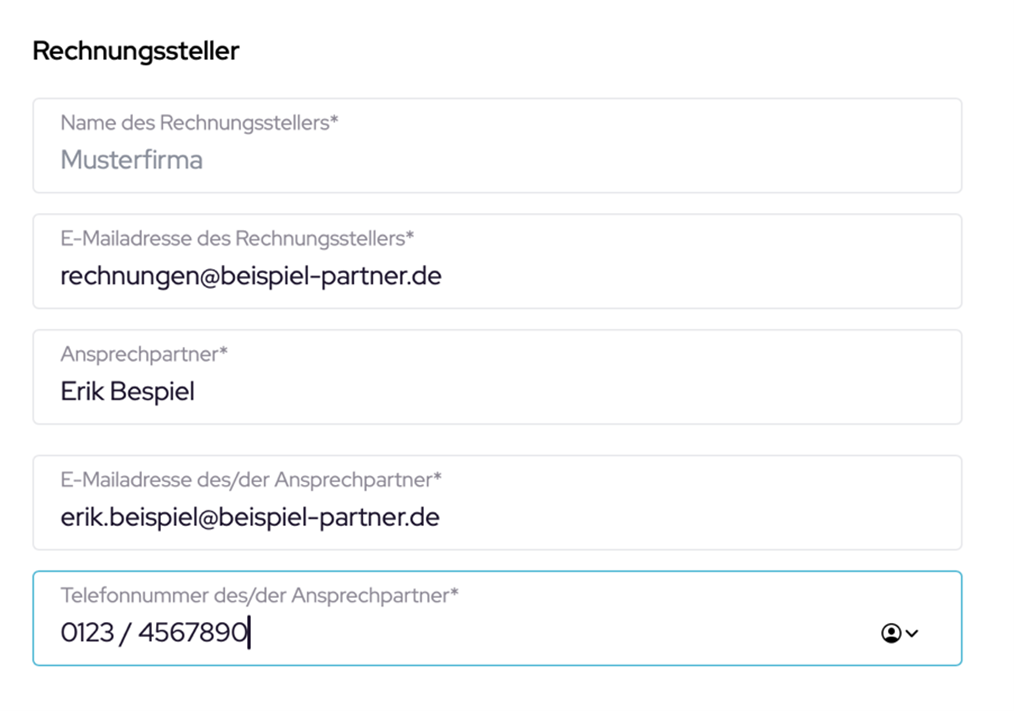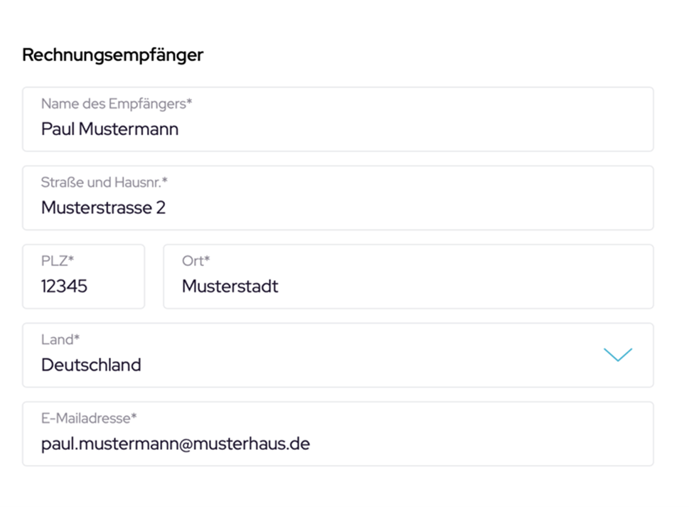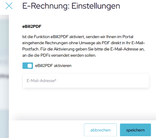 Geben Sie die E-Mail-Adresse ein, an die Ihre eingegangenen E-Rechnung als PDF-Arbeitskopie gesendet werden soll. Idealerweise die Adresse, über die Sie bislang Ihre Rechnungen empfangen haben.