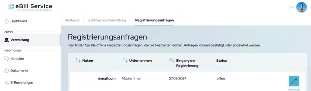 Sobald sich die eingeladene Person erfolgreich registriert hat, können Sie dies unter Verwaltung -> Registrierungsanfragen einsehen. Dort werden alle offenen Anfragen der Personen angezeigt, die den Link von Ihnen erhalten haben. Um diesen Personen den Zugriff auf eBill zu ermöglichen, klicken Sie auf „bearbeiten“.