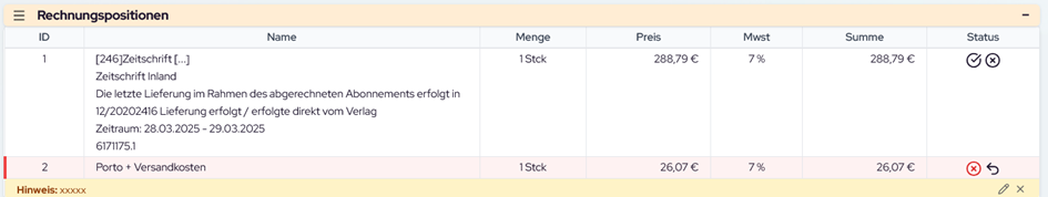 Jede Rechnungsposition kann durch Anklicken markiert werden. Nach der Markierung: