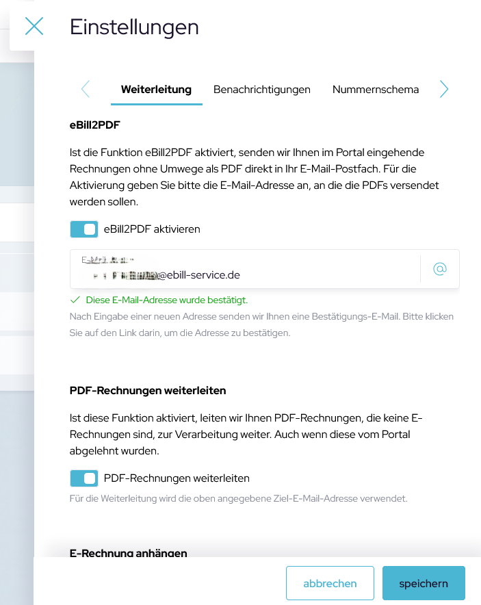 Sofern Sie die Funktion „eBill2PDF“ aktiviert haben, können Sie als weitere Option auch die „PDF-Rechnungen weiterleiten“ aktivieren.
